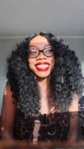 Black Findom Goddess Candy Divine wearing purple lingerie, her cleavage front and center, with a gorgeous shaved head and her eyes closed, relishing in all of the cash her Good Ones, like you, sent her.